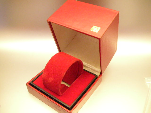100% New Old Stock Red Omega Rectangular Watch Box. Circa 1940/50s. 100% UNUSED Condition, purchased from an old watch store winding up after years of business. This is leather lined on the exterior and satin lined on the ceiling and felt-lined on display insert. Plastic based is fully signed with Omega Model No. and product reference number. These boxes will definitely add value to your precious Omega collections.
