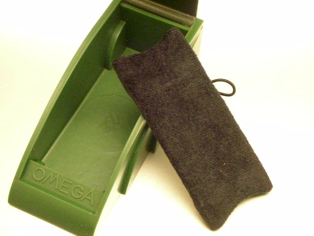 of the box when opened. When closed, the sturdy bakelite body adds protection to your watch, a very useful and well thought through design indeed. Top lid is in dark green color whilst the base is in lighter shade of green. Box measures 10.2cm x 4.5cm. NEW OLD STOCK ART DECO ERA OMEGA BAKELITE WATCH BOX PERFECT FOR STORING OR DISPLAYING YOUR OMEGA WATCHES.